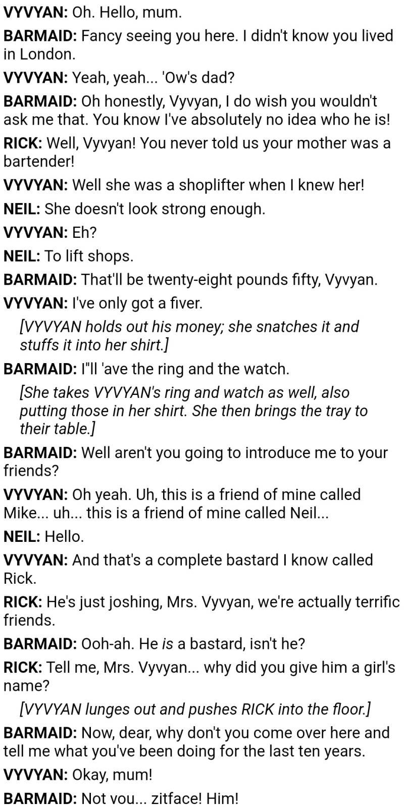 The Young Ones - Boring - the ferocity of actor Pauline Melville's (Vyvyan's mum) enunciation of "Zit face!" can still be felt some forty years later.